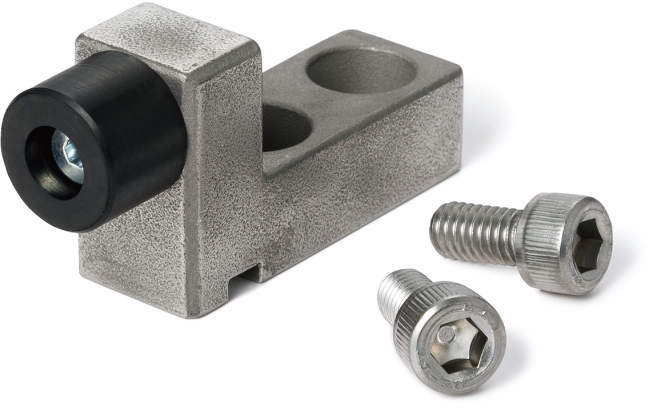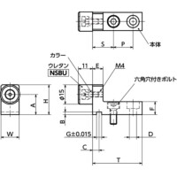 ・ウレタン「NSBU」を組み込んだコンパクトタイプのリニアガイド用ストッパ。機器・装置の省スペース化やスペースが限られた箇所に。