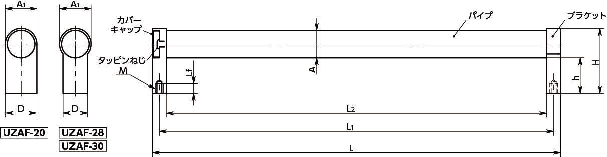| パイプ | UZAF-AL・UZAF-ES:アルミニウム合金、アルマイト処理(シルバー) UZAF-BK:アルミニウム合金、静電塗装(つや消し黒) |