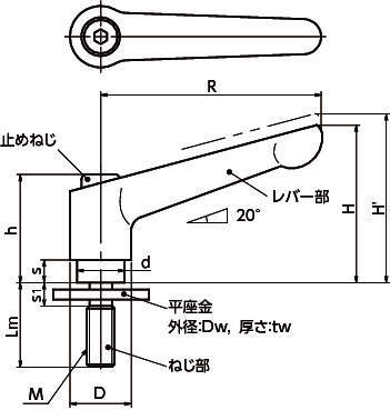・平座金が組み込まれたクランプレバー。