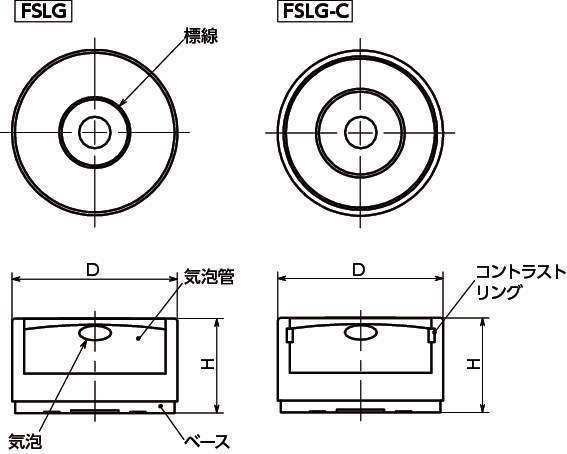 ・水平基準面はありません。機器・装置が水平な状態で気泡を標線の中心に合わせて取りつけてください。