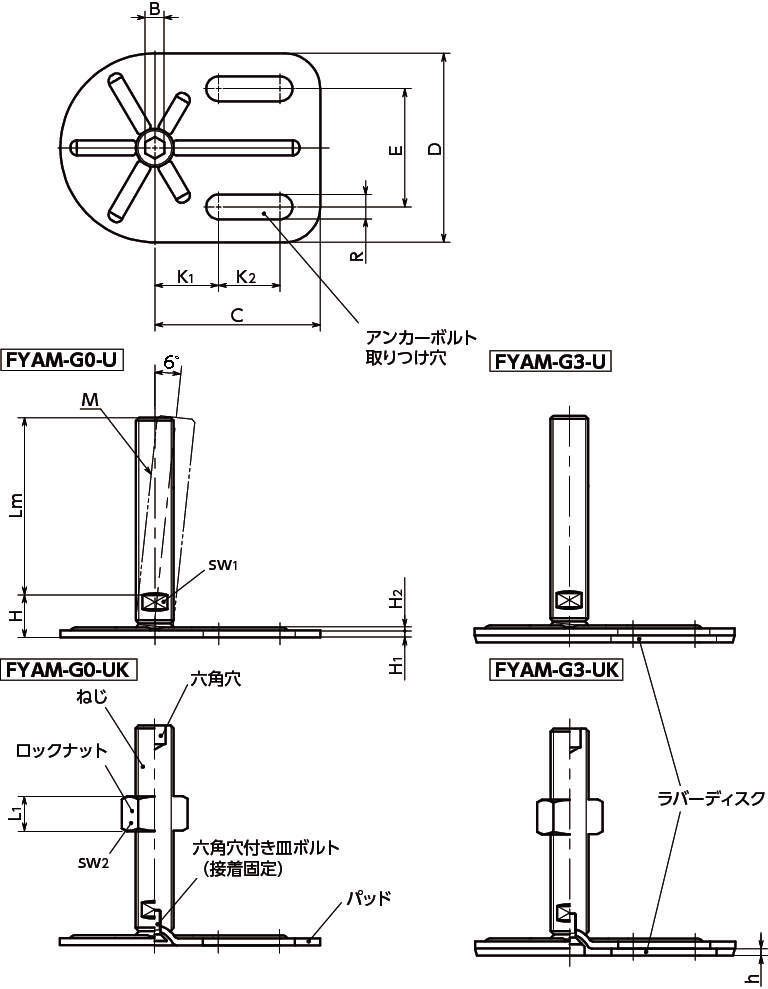レベリングアジャスタ(おねじ) アンカー固定タイプ 六角穴つき FYAM-G-U
