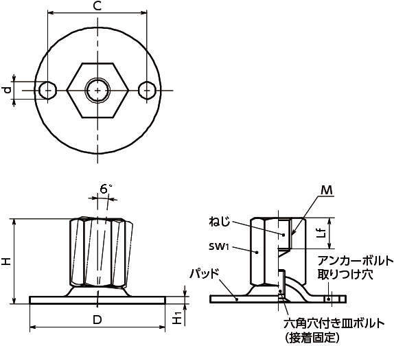 ・アンカーボルト用の取りつけ穴は2カ所です。床面への設置後、パッドの回転ずれ防止に効果的です。