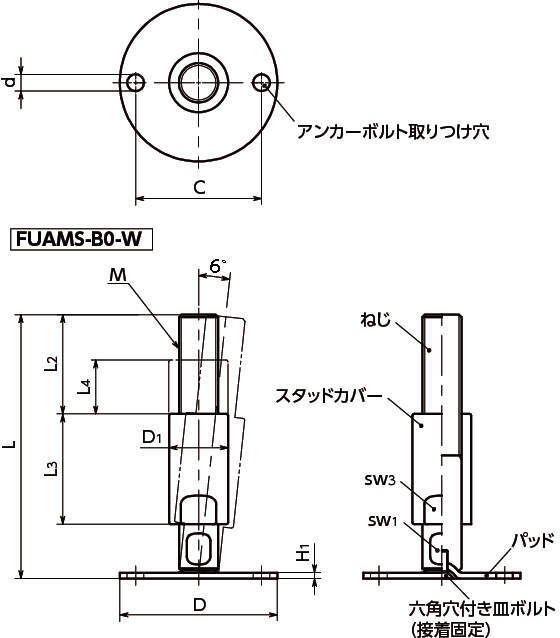 レベリングアジャスタ(おねじ) アンカー固定タイプ スタッドカバーつき FUAMS-B0-W