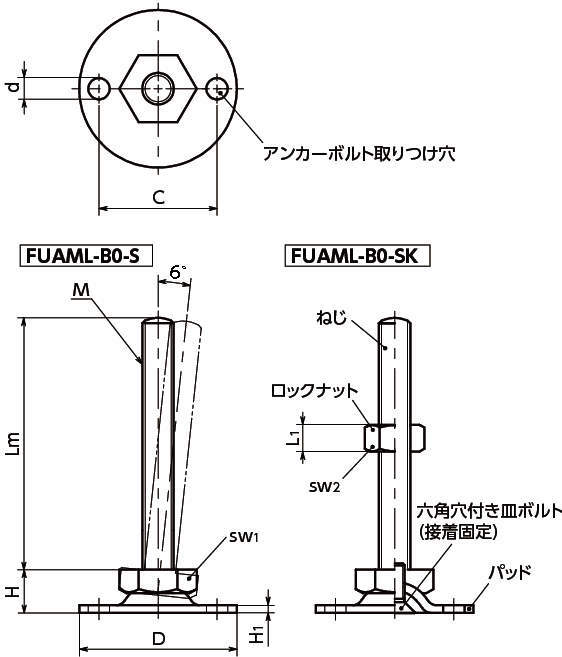 レベリングアジャスタ(おねじ) SUS316L アンカー固定タイプ 六角調整 FUAML-B0-S