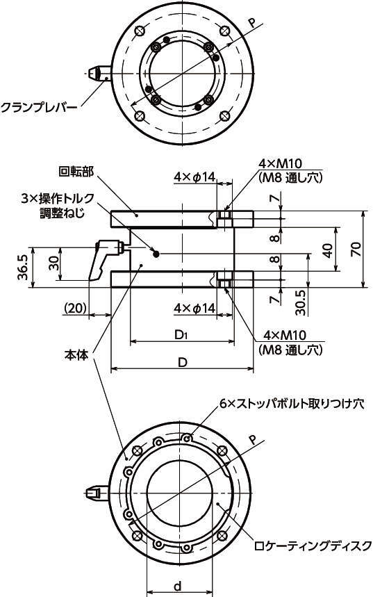 ・回転部と本体それぞれのフランジの取りつけ穴は、上面・下面どちらからの取りつけにも対応しています。取りつける機器・装置にあわせてご使用ください。