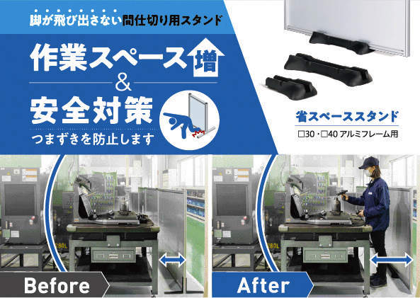 ・脚がT字やL字型のスタンドに比べ、通路や作業スペースへの張り出しを抑えるので、作業スペースを増やし工場敷地面積を有効活用できます。