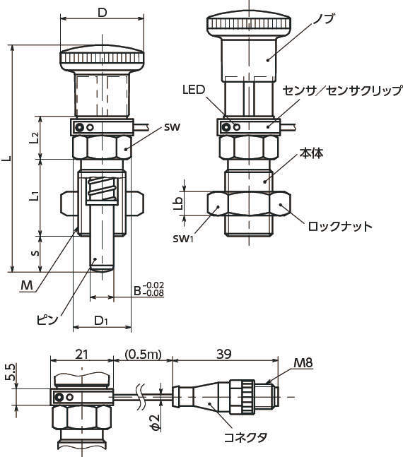・ピンと一体構造のノブにセンサ検出用のマグネットを内蔵。ピンを引込めた状態からストローク(s)の約2/3を超えたところでセンサの状態が切り替わり、信号を出力します。