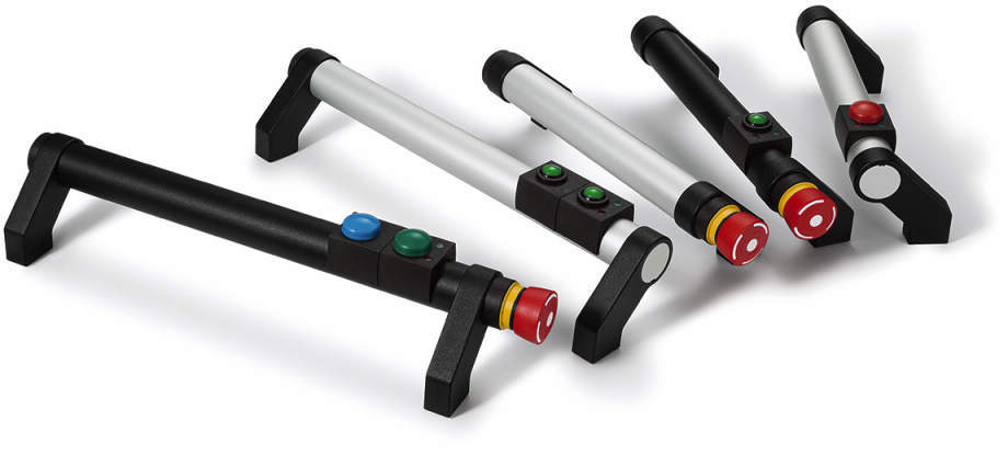 ・スイッチ・非常停止ボタン・LEDを組み合わせたアルミチューブラ取っ手。設計・施工の手間を削減します。