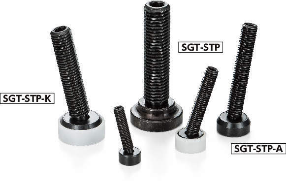 ・SGT-STP-Kはポリアセタール製のプラスティックキャップつき。スラストパッド面の摩擦が小さく、ワーク表面をすべらせて使用する用途に適しています。