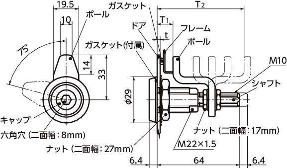 ・六角穴をまわすと、ポールが後退してロックがはずれます。さらにまわすと、ポールは75°回転し、ドアをあけることができます。