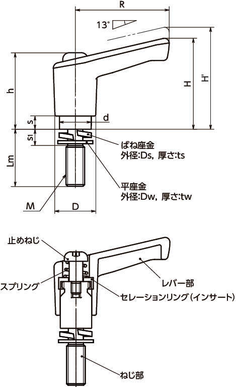■亜鉛ダイカスト製のセレーションリングをプラスティック製レバー本体にインサート。金属製のねじのセレーションとのかみ合いにも充分な強度を実現しています。