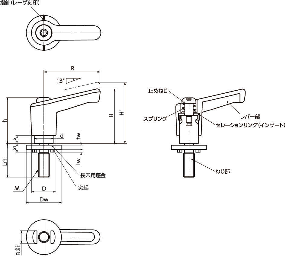 型式 タイプ 材質 レバー色 M(並目) R H H' h s D d Dw tw Lw s1 B Lm 歯数 最大荷重