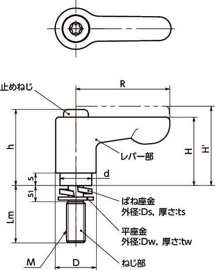 型式 タイプ 材質 レバー色 M(並目) R H H' h s D d Ds ts Dw tw s1 Lm 歯数 最大荷重