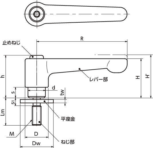 型式 タイプ 材質 レバー色 M(並目) R H H' h s D d Dw tw s1 Lm 歯数 最大荷重