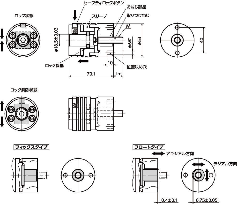・フロートタイプはおねじ部品と本体の間にあそびがあり、同一装置に「FQRM」を複数使用する場合など、ラジアルおよびアキシアル方向のオフセットを補正する必要がある場合に適しています。