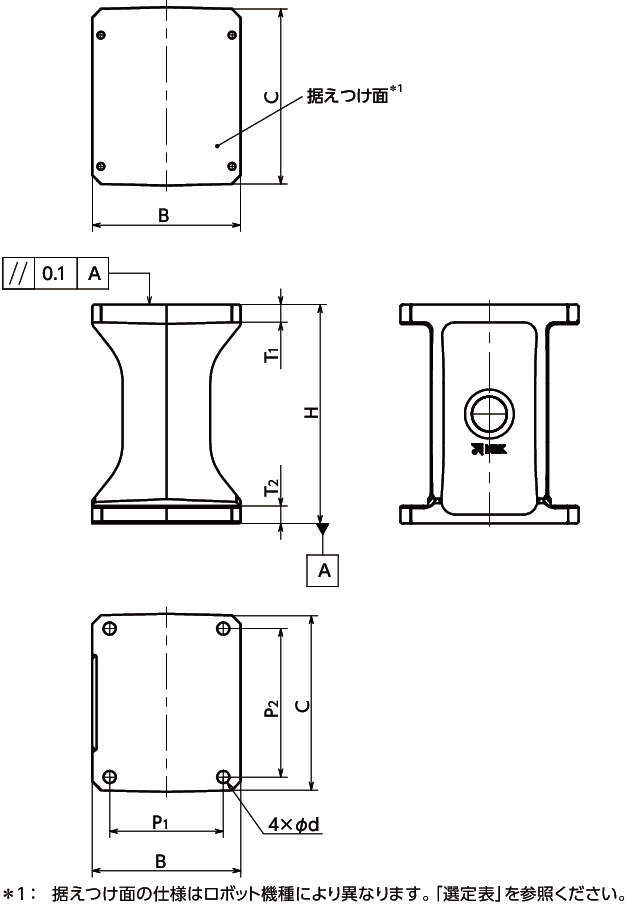 ・ロボット据えつけ面のねじ穴を貫通穴にできない場合の有効ねじ深さは、T1寸法になります。