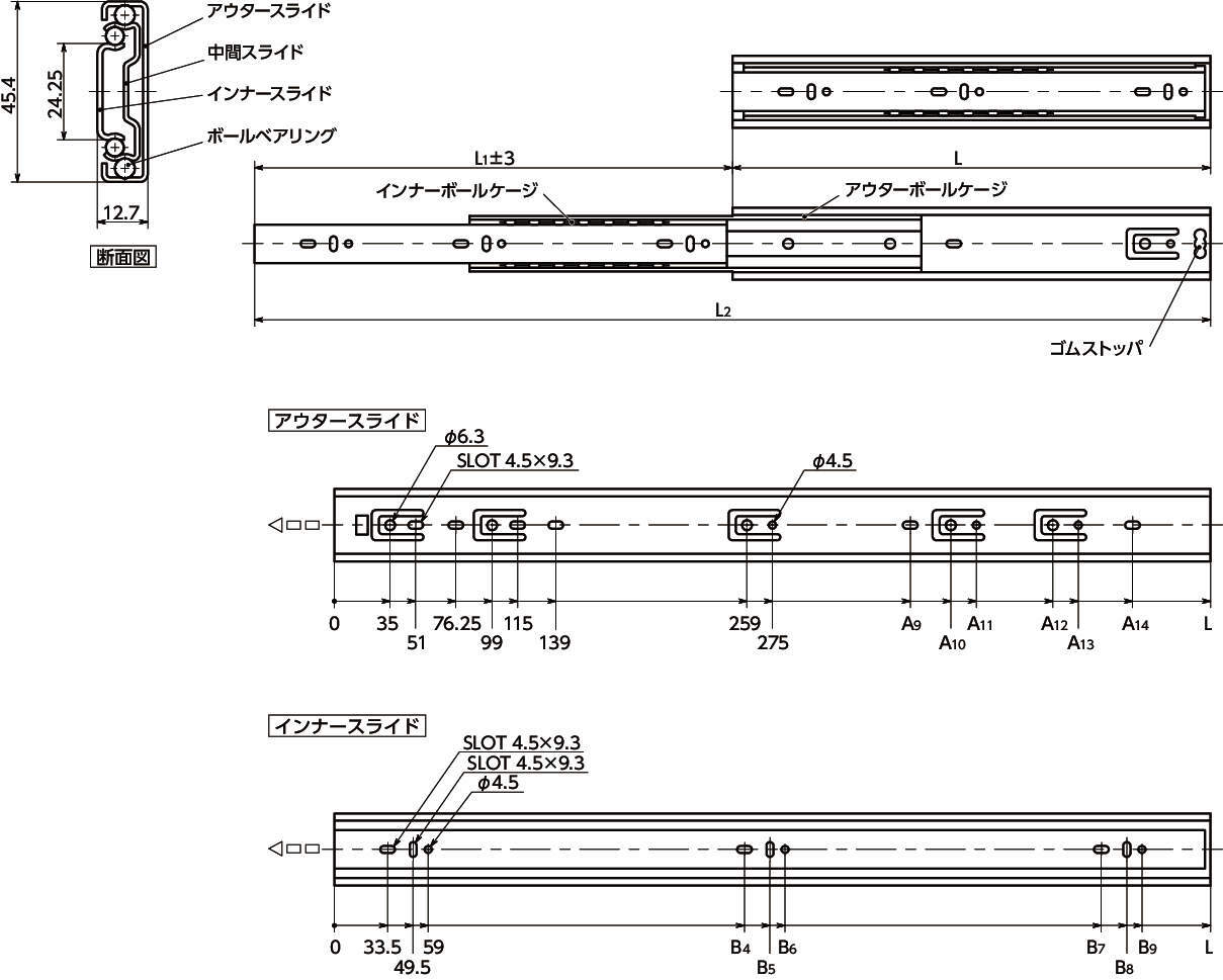 ・3段引のスライドレール。