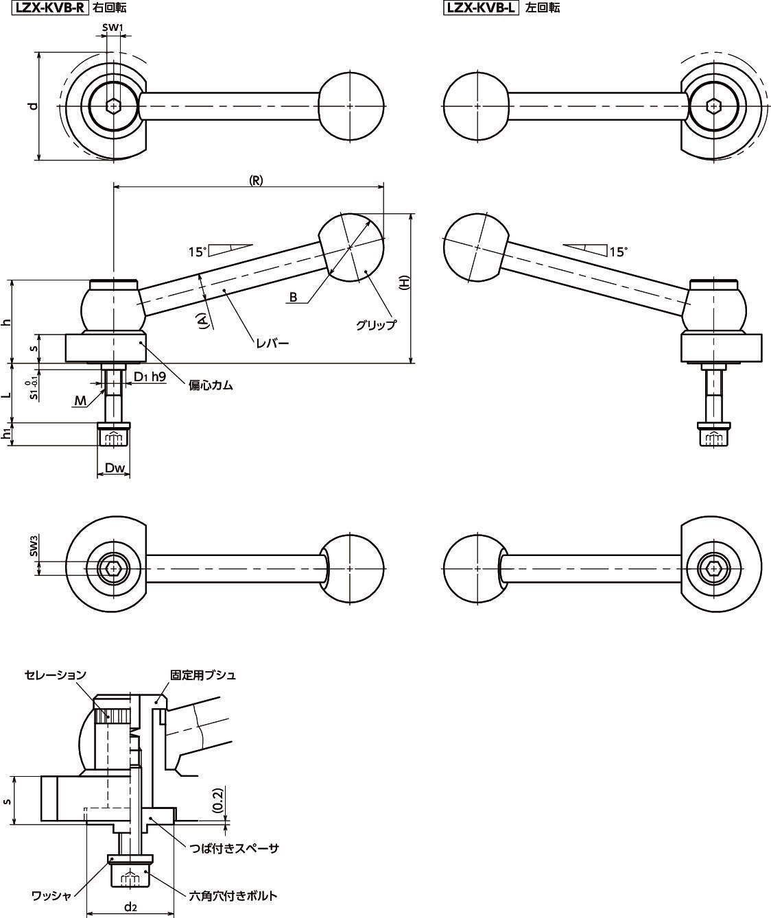 ・カムレバーは、偏心カム・つば付きスペーサ・固定用ブシュ・六角穴付きボルト・ワッシャ・レバーで構成されています。