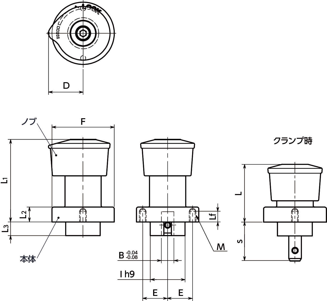・ノブの突起とレーザ刻印により、クランプ形状が一目で確認できます。