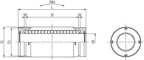 ・NBスライドブッシュは円筒形状の外筒に保持器が組み込まれ、保持器の案内部はボールが滑らかに循環できるように設計・製作されており、滑らかな直線運動を可能にしています。
