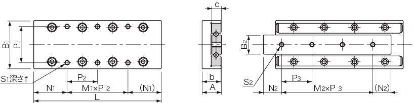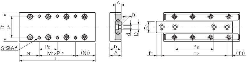 A B1 L (mm) b (mm) B2 (mm) c (mm) P1 (mm) S1 f (mm) N1 (mm) M1×P2 (mm) S2 N2 (mm) M2×P3 (mm) d×D×h (mm) f1 (mm) f2 (mm) f3 (mm) T (μm) S (μm) MP (N・m) MY (N・m) MR (N・m)