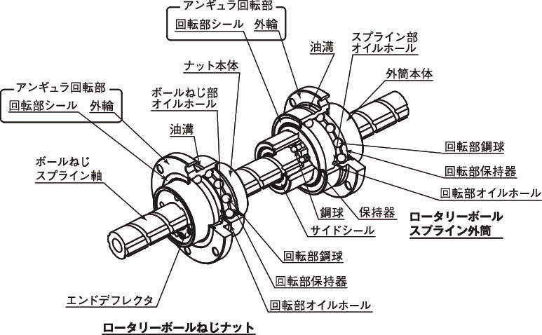 ・SPBR形はボールねじナットとボールスプライン外筒に高速回転が可能なアンギュラコンタクトの回転部を一体としたロータリーボールねじナットとロータリーボールスプライン外筒が組合わされています。