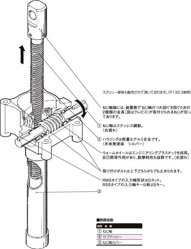 ■ジャッキは高精度のウォーム歯車とステンレス製ねじ軸で構成されています。
