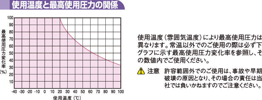 | 使用温度範囲 | 空気:-40℃~+100℃ 水:0℃~+70℃ 水性塗料:0℃~+40℃(水性塗料及び脂肪族系・芳香族系炭化水素の溶剤) |