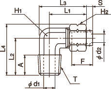 DL10-PT1/8 90℃エルボ DL DKチューブ専用 φ10mm φ6.8mm R1/8 27.1 22.0 35.2 31.8 11.0 17 14 17 4.2 5 5.7 16 42