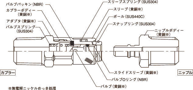 | 本体材質 | 真鍮(C3604) 無電解ニッケルメッキ処理(ELp-Cu/Ni-P) |