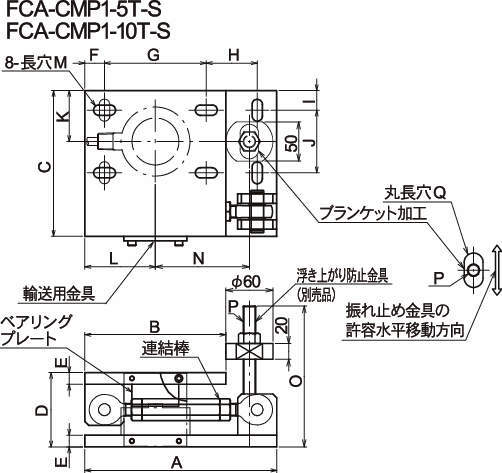 型式 適用ロードセル 許容水平荷重 許容水平移動量 材質 A B C D E F G H I J K L M N O P Q 質量