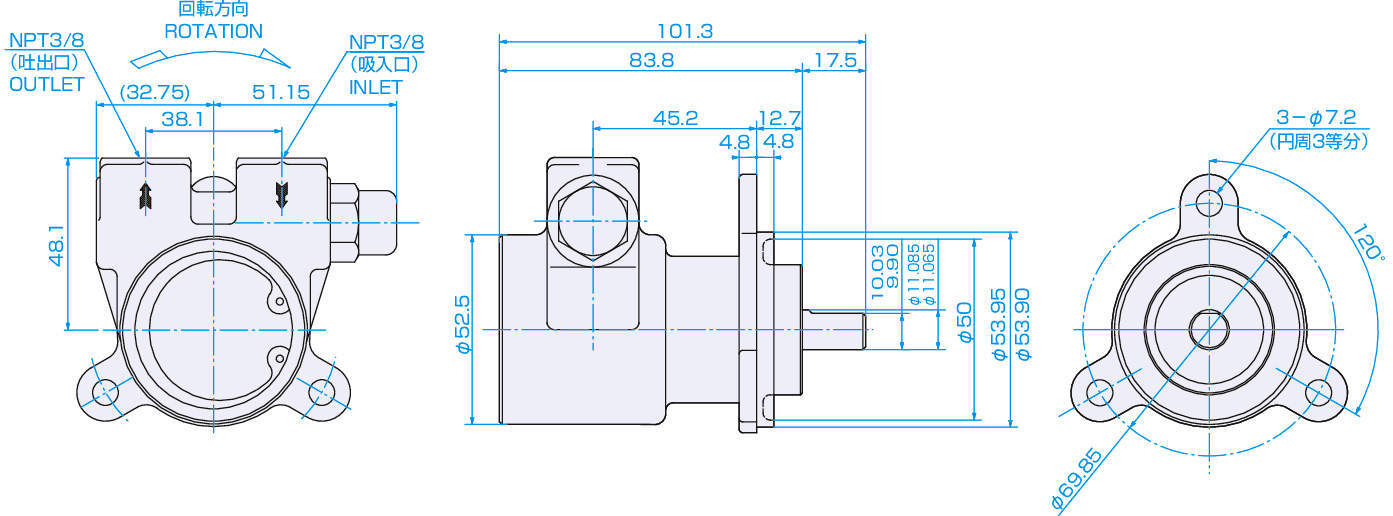 ・回転するベーン(羽根)によって水を移送する自吸式のポンプです。