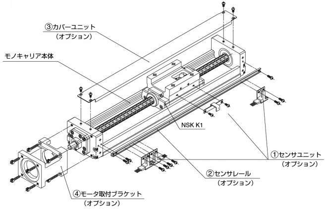 ・モノキャリアはNSKが長年にわたって培った技術力を結集し、信頼性の高いNSK製ボールねじ、リニアガイド、サポート軸受が一体となった軽量コンパクトな一軸アクチュエータです。