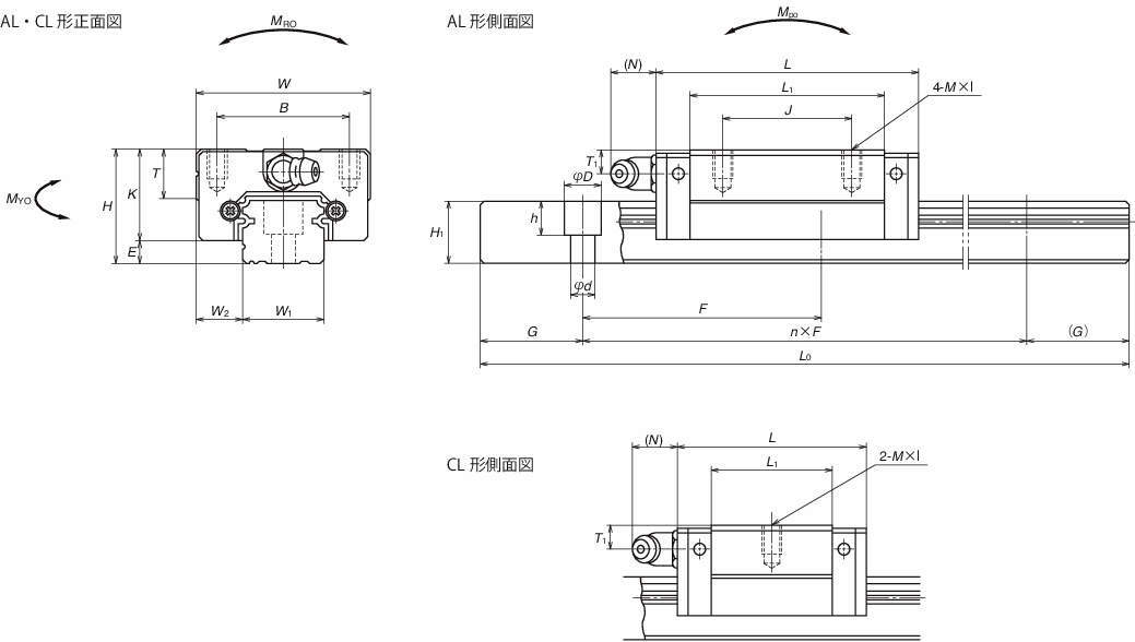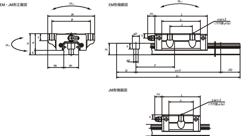 リニアガイドの組立高さ・組立幅寸法、取付穴ねじ径・ピッチなど、取付まわりの寸法(組立品寸法)は、NSシリーズは従来のLSシリーズと同じ寸法です。機械の設計変更が不要で、NSシリーズをご使用になれます。