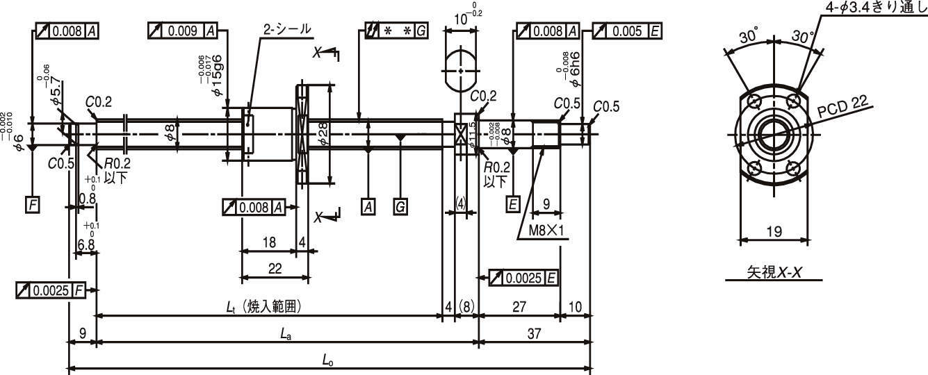 型式 ねじ軸径 リード ねじれ方向 ボール径 ねじ軸谷径 有効巻数 ストローク ねじ軸長さ リード精度 軸心の振れ 質量