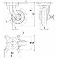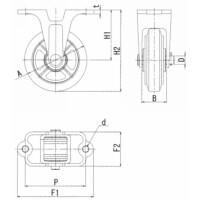 | 金具高さ H1 | 車輪付高さ H2 | 車輪取付幅 B | 取付穴径 d | シャフト径 D | 偏心 E | 取付ピッチ P1×P2 | 取付座 F1×F2 | ||||