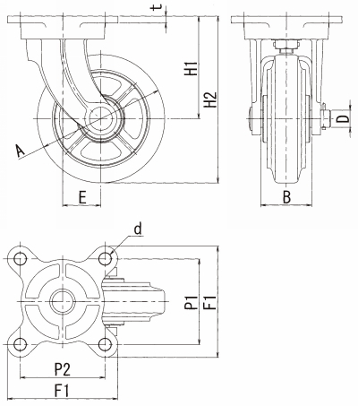 | 金具高さ H1 | 車輪付高さ H2 | 車輪取付幅 B | 取付穴径 d | シャフト径 D | 偏心 E | 取付ピッチ P1×P2 | 取付座 F1×F2 | ||||