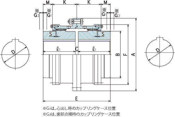 ・GCカップリングは、カップリングケースの内歯平歯車とカップリングセンターのクラウニングを施した外歯平歯車の噛合により構成されています。