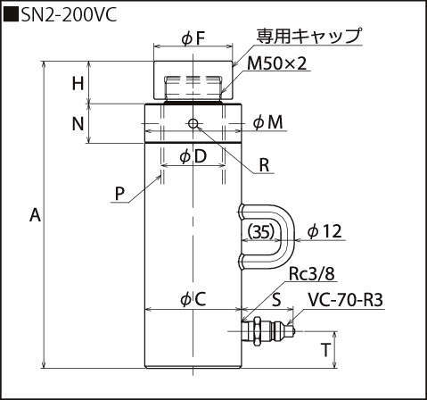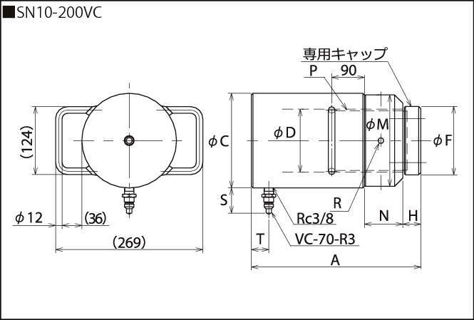| SN2-200VC | VC-70-R3 | 200 | 387 | 86 | 57 | 70 | 38 | 86 | 35 | 4- φ8 | 57×6 | 約46 | 33 | 専用キャップ | 664 | 14.0 |