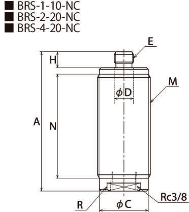 | BR-2-20-NC | カップラ無し | 20 | 3.14 | 20 | 97 | 20 | 60 | 16 | M16×1.5 | 40 | 16 | - | M36×2 | 15 | 25 | 7 | 1.1 |