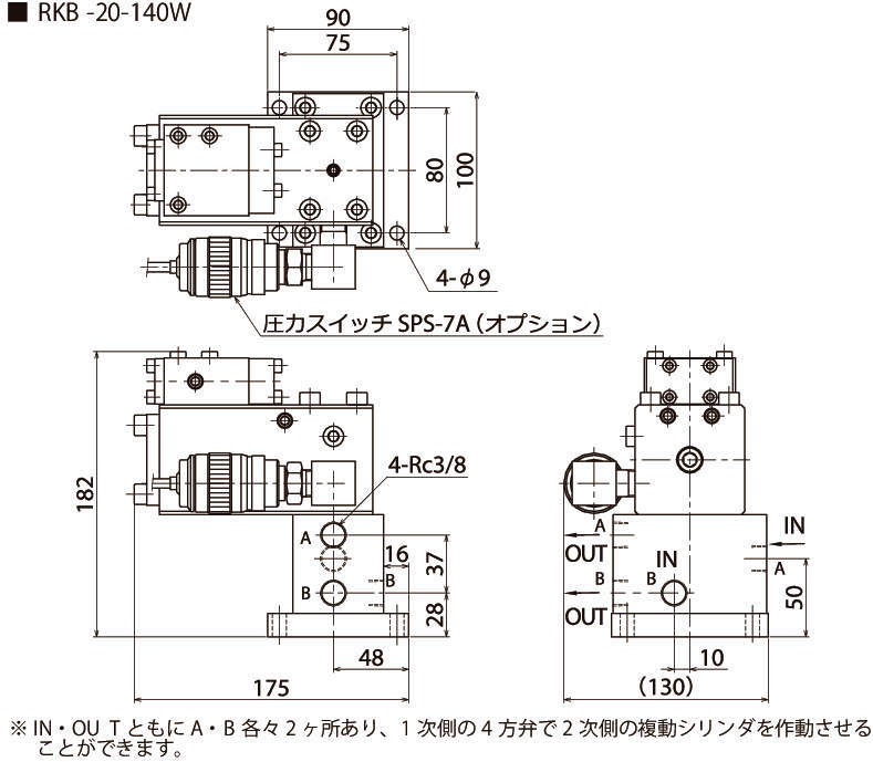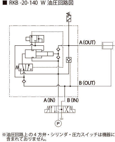 ・RKB-20-140W型はIN・OUT共にA・B各久2ヶ所あり、1次側の4方弁で2次側の複動シリンダを作動させることができます。