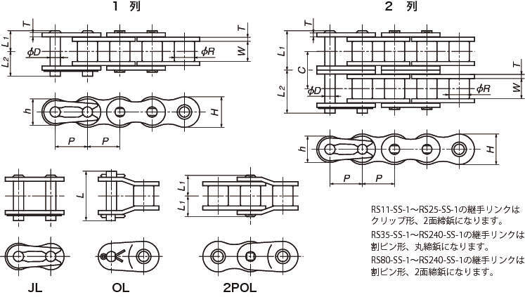 ・RSローラチェーン、RSコーティングドライブチェーンより耐食性に優れて、水中、酸性、アルカリ性などの腐食雰囲気や低温、高温(-20℃~400℃)の特殊雰囲気で使用できます。