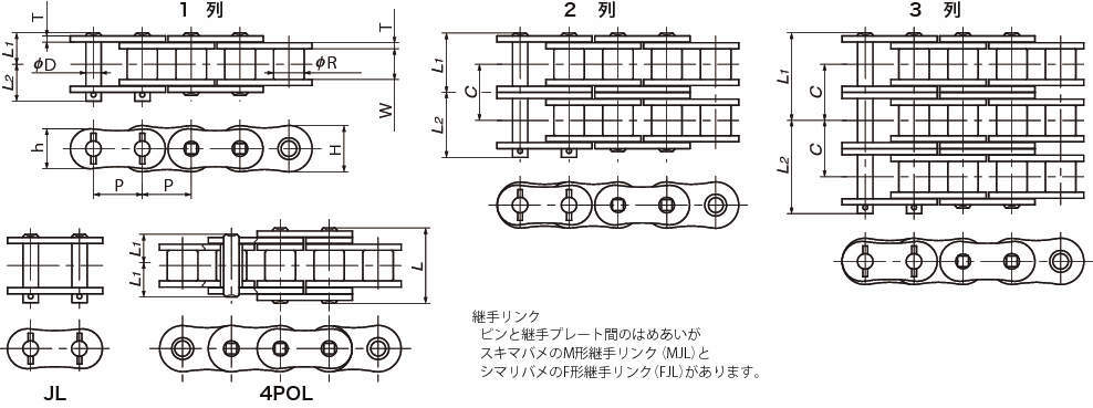 ・基本3寸法(ピッチ、ローラ径、内リンク内幅)はRSローラチェーンと同じです。