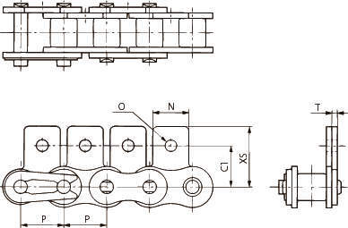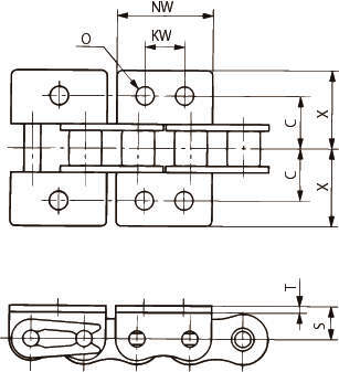 | 型式 | 間隔 | 厚さT | 幅H | ピン径D | L1 | L2 | C | C1 | N | O | S | X | X2 | XS | L3 | L4 | NW(外リンク) | NW(内リンク) | KW | |||||||||||