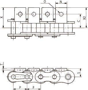 | 形式 | 間隔 | 厚さ T | 幅 H | ピン径 D | L1 | L2 | C | C1 | N | O | S | X | X2 | XS | L3 | L4 | 概略 (チェーン本体) | アタッチメント 1個当たりの付加 | |||||||||