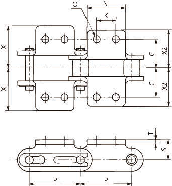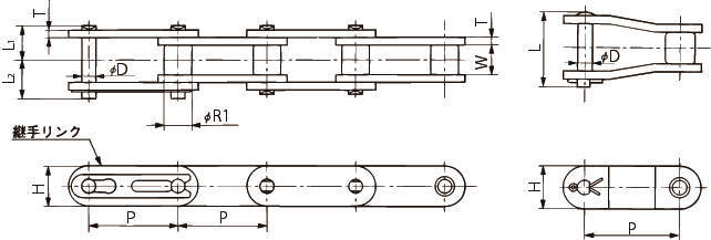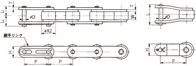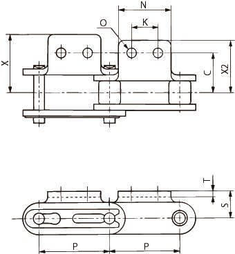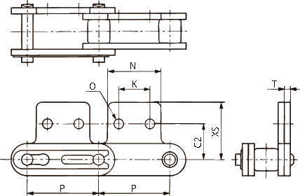 ・一般用A系ローラチェーンのピッチを2倍にし、プレートをフラット形状とし、アタッチメントを付けた搬送用チェーンで、ISO1275のA系、ASME B29.100、JIS B1803に規定されています。