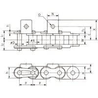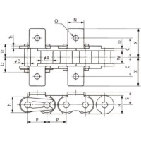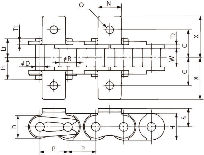 | 形式 | 間隔 | 厚さ T1 | 厚さ T2 | 幅 H | 幅 h | ピン径 D | L1 | L2 | C | N | O | S | X | 概略 (チェーン本体) | アタッチメント 1個当たりの付加 | ||||||||