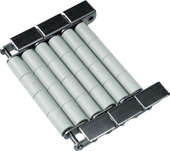・チェーンのピッチライン上にプラローラが付いているので、屈曲時にもプラローラ間隔が変わりません。