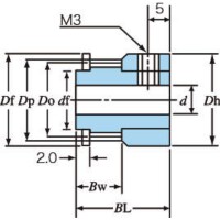 | 型式 | 歯形 | プーリ 形状 | 材質 | 歯数 | 使用 ベルト幅 (mm) | ピッチ円直径 Dp (mm) | 歯先円直径 Do (mm) | ハブ直径 Dh (mm) | Bw (mm) | BL (mm) | 使用軸の直径d(mm) | 標準フランジ | フランジ(mm) | |||