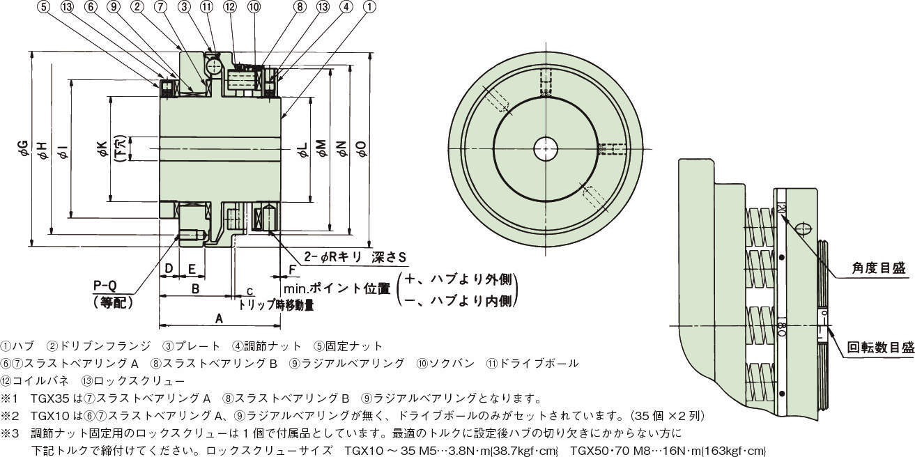 | TGX35-L | レッド×5 | 23~68 | 800 | 12 | 35 | 68 | 37.5 | 2.0 | 11 | 11.6 | -0.5 | 107 | 88 | 70 | M50×1.5 | M55×1.5 | 88 | 91 | 107 | 6 | M6-7 | 6 | 10 | 0.333×10^-2 | 1.33×10^-2 | 2.51 |